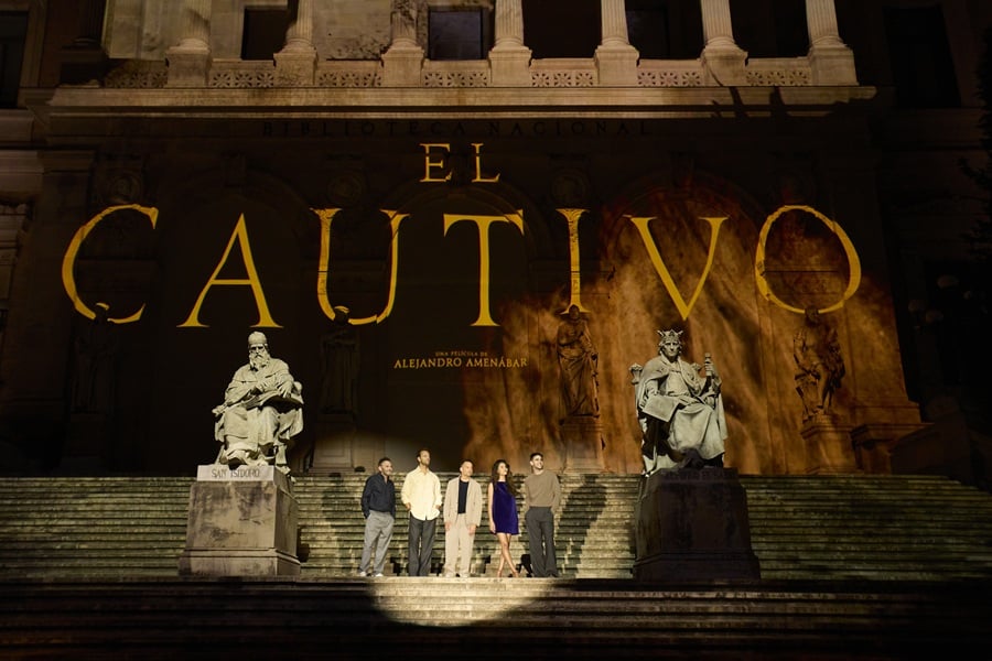 En la antesala del estreno de El Cautivo, la nueva película del oscarizado Alejandro Amenábar, el director, junto a los actores protagonistas se ha reencontrado en la emblemática Biblioteca Nacional de España. El director ganador del Óscar® y los actores Julio Peña Fernández, Alessandro Borghi, Fernando Tejero y Luna Berroa se dieron cita en las escaleras del icónico edificio de Recoletos, sede de las letras españolas, para participar en una proyección especial sobre las escaleras y fachada principal. Es la primera vez que tiene lugar un espectáculo visual como este en la Biblioteca Nacional. El encuentro marca el inicio de la gira promocional de El Cautivo, que narra las vivencias del joven Miguel de Cervantes —interpretado por Julio Peña Fernández— durante su cautiverio en Argel. La película llegará a los cines el próximo 12 de septiembre tras su estreno mundial en el Festival Internacional de cine de Toronto.