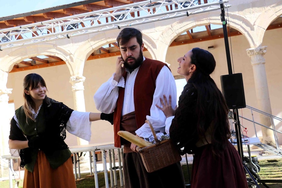 Los visitantes pudieron, después de la lectura, conocer con detalle el monumento del Palacio Renacentista, de la mano de los actores de Ditirambo. Y, poco antes del mediodía, disfrutaron con la representación de Tierra de Jauja, un entremés del escritor sevillano Lope de Rueda, considerado el fundador del teatro popular y profesional español.