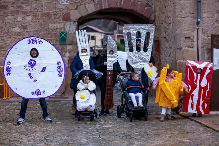 El pregón lo daba el grupo de ‘Las Dulces Meriendas Seguntinas’ – Paula, Lara, Nora y Alba-, ganador del concurso en 2024, precedido por el saludo de la alcaldesa de Sigüenza, María Jesús Merino. Un año más, la batucada Batuqué, formada por más veinte seguntinos y dirigida por Fernando Álvarez, animaba el recorrido del pasacalles al ritmo de sus tambores. Había llovido sobre la ciudad, pero el agua no impidió el desfile.