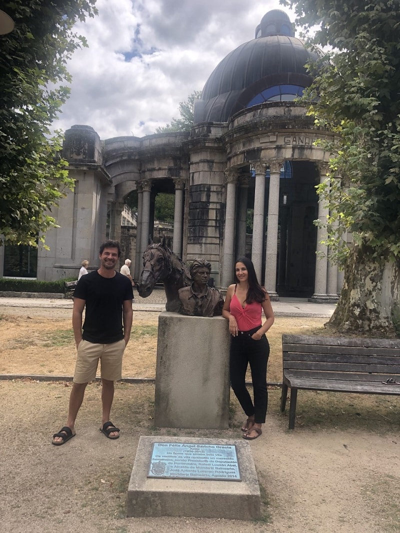 El último viaje del actor Rodolfo Sancho a Balneario de Mondariz, hace ahora ocho años, tuvo que ver con el homenaje a su padre, Sancho Gracia, y la inauguración de una escultura caracterizado como su mítico personaje, Curro Jiménez, frente a la Fuente de Gándara. Ahora el regreso a las vacaciones de la infancia y la juventud del popular Fernando de la serie de TVE “Isabel”, tiene un mismo objetivo, recordarlo, con su pareja, la también actriz Xenia Tostado, y la hija pequeña de ambos.