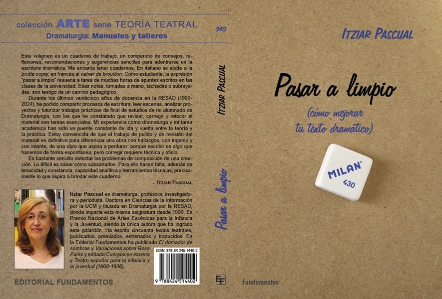 El próximo día 3 de noviembre se presentará en el XXV Salón Internacional del Libro Teatral que organiza la AAT (Asociación de Autoras y Autores de Teatro) en colaboración con el CDN (Centro Dramático Nacional) el libro Pasar a limpio (Cómo mejorar tu texto dramático) de Itziar Pascual, en el que la autora recoge un compendio de reflexiones de sus veinticinco años de docencia en el departamento de Escritura y Ciencias Teatrales de la RESAD (Real Escuela Superior de Arte Dramático). Este libro está publicado por la editorial Fundamentos, que lleva varias décadas editando obras que ofrecen una amplia visión de distintos ámbitos del arte dramático, tanto en su colección Teoría Teatral, con importantes obras de referencia de diferentes épocas, como en su corpus de textos dramáticos, y cuyos volúmenes son ampliamente consultados por profesionales del teatro y aficionados.
