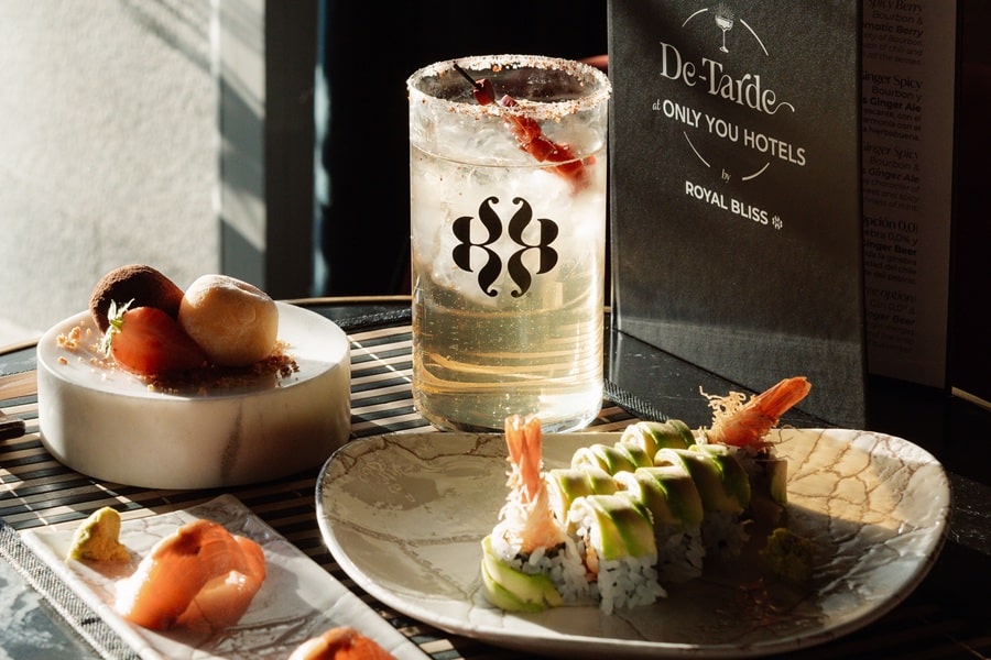 En Only YOU Hotel Atocha el menú combina lo mejor de la gastronomía japonesa con California Roll, Nigiris de salmón y Mochis, acompañados de cócteles como el Spicy Berry, que mezcla Bourbon y Royal Bliss Aromatic Berry. En Only YOU Boutique Hotel Madrid, la inspiración llega de Japón con Uramaki de salmón con plátano canario frito y Niguiri de atún con tomate concassé y wasabi, que pueden maridarse un Gintonic Japonés elaborado con ginebra y Royal Bliss Signature Tonic Water, o su versión sin alcohol. La propuesta en Only YOU Hotel Sevilla incluye, por ejemplo, Niguiri de pez limón, Sashimi de salmón y Soufflé de praliné de avellanas para disfrutar con Osaka Tonic, con ginebra sake y Royal Bliss Signature Tonic Water. En Only YOU Hotel Málaga apuesta por Uramaki de salmón con plátano canario frito y Niguiri de atún con tomate concasse y wasabi junto a los cócteles. Por último, en Only YOU Hotel Valencia los clientes podrán disfrutar de un Spicy Tuna Roll con wonton crujiente, aguacate y tofu-feta, seguido de un postre Lemon Crunch y cócteles como el Summertime, que mezcla vodka, Campari y Royal Bliss Aromatic Berry; o el Passion Spritz 0%, una opción sin alcohol.