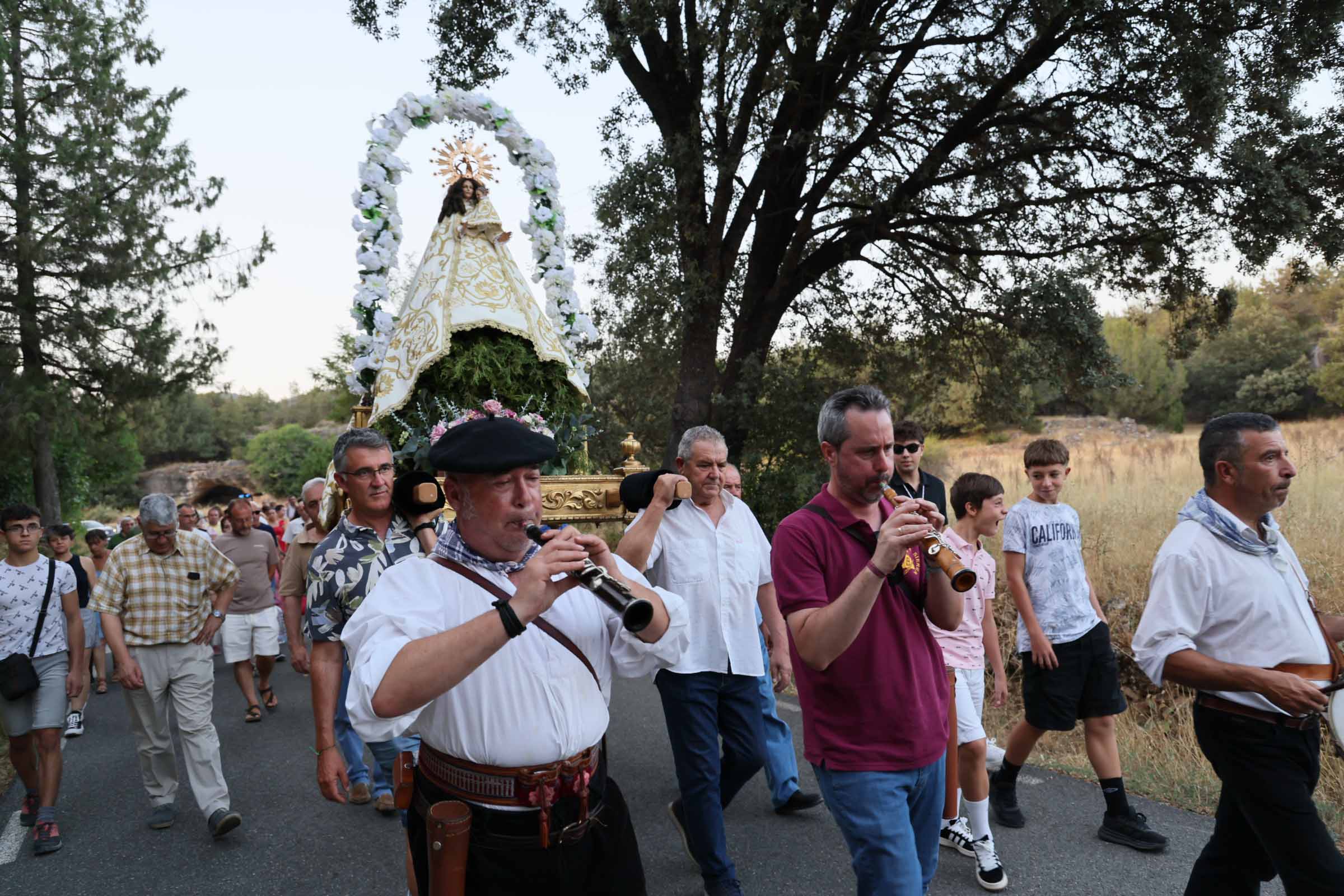 Pasadas las 20:30 horas, la Virgen salió de la ermita portada a hombros por los agalloneros, en el arranque de una procesión que discurrió entre sabinas centenarias, enebros y formaciones rocosas de gran belleza natural. Durante todo el trayecto, las dulzainas y tamboriles de los Gaiteros Mirasierra —fieles a la cita desde hace más de dos décadas— acompañaron la comitiva con música tradicional que llenaban de autenticidad el ambiente. Faltó, muy a su pesar, el gran Valentín Pérez, gaitero de Atanzón, y hermano de honor de la hermandad de la Virgen de los Enebrales, a quien todo el pueblo de Tamajón desea una pronta recuperación para verlo pronto tocando de nuevo, y dándole alegría a las celebraciones agalloneras.